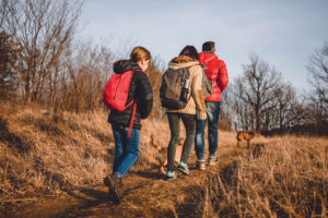 Family hiking at mountain with dog