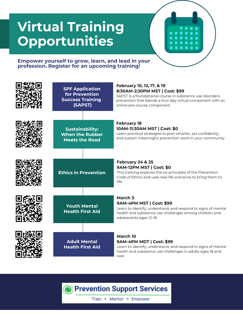 • 102A Pre-SAPST (prerequisite SAPST) – Become familiar with the foundational prevention knowledge; learn the history of prevention.