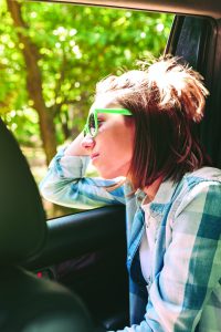 Young woman looking landscape through the window car